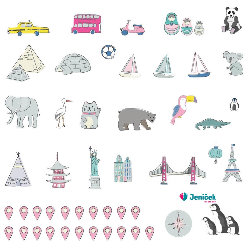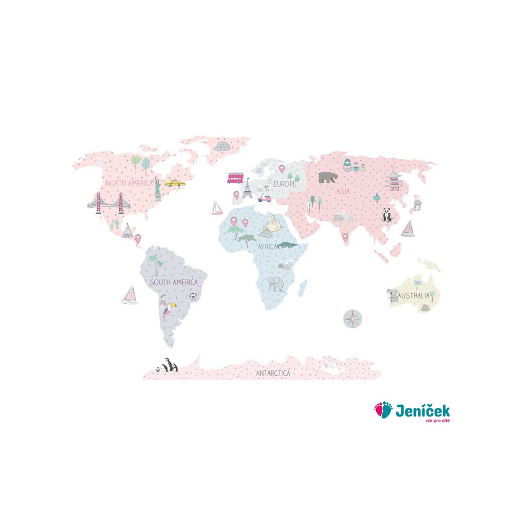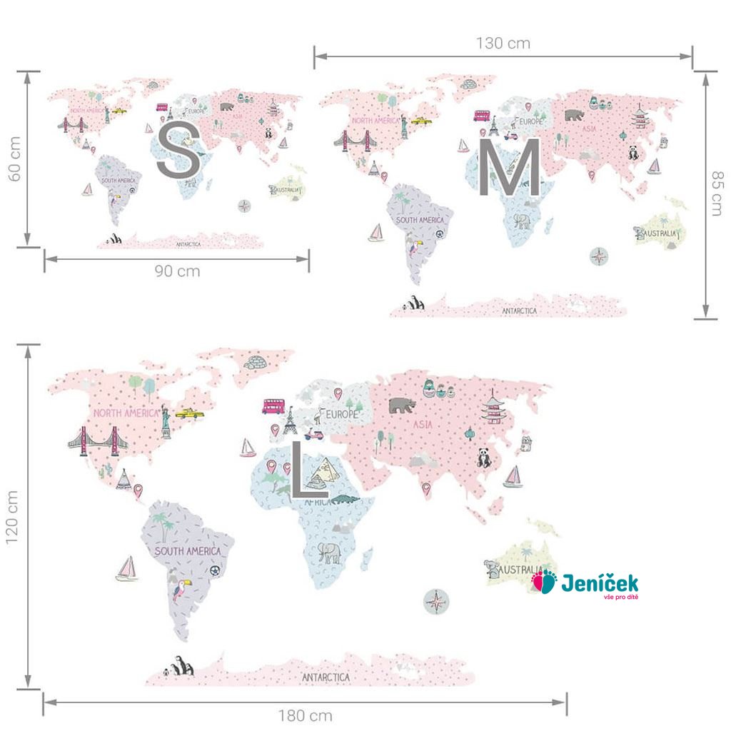 kontinenty, ostrovy a doplňkové (vzdělávací) prvky M (130x85 cm). Přesné rozměry každé části nálepky jsou uvedeny na poslední fotografii. Upozornění: Nedoporučujeme aplikovat naše samolepky na stěny natřené latexovými, hladkými nebo voskovými barvami. Baleno v eko tubách.
