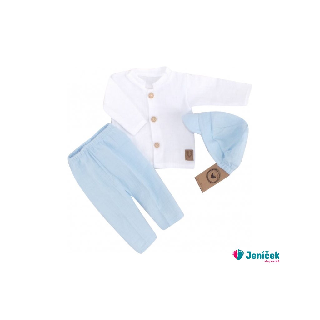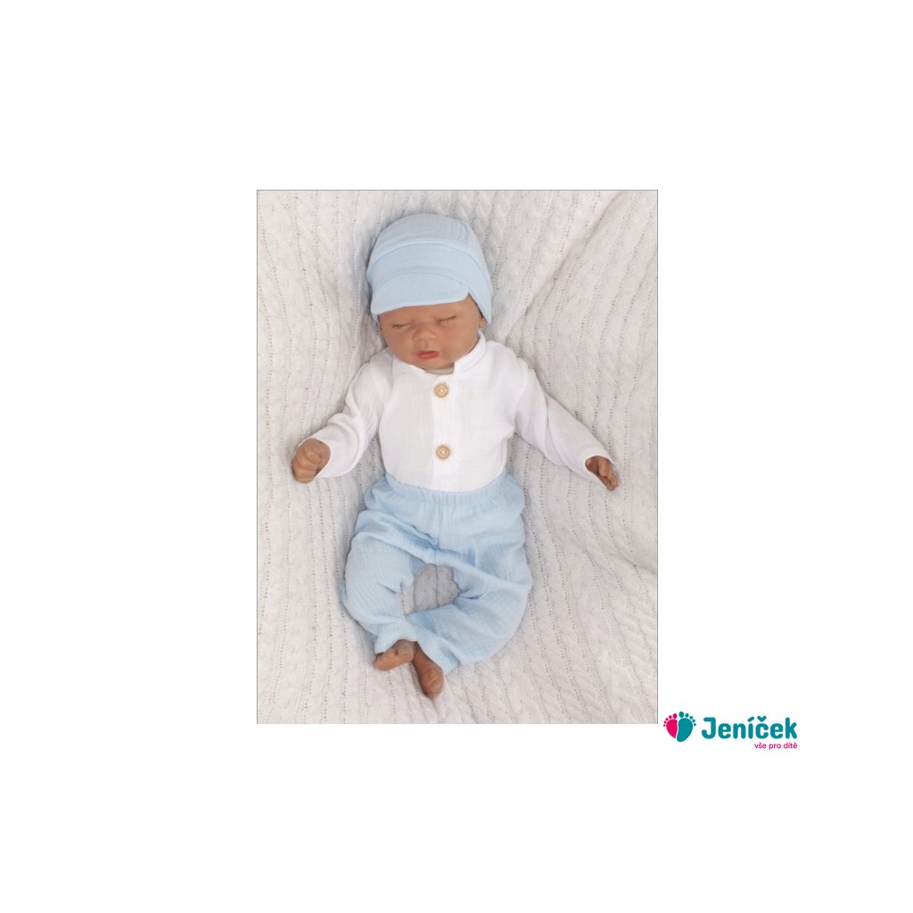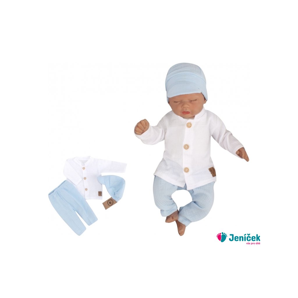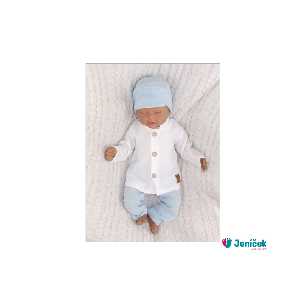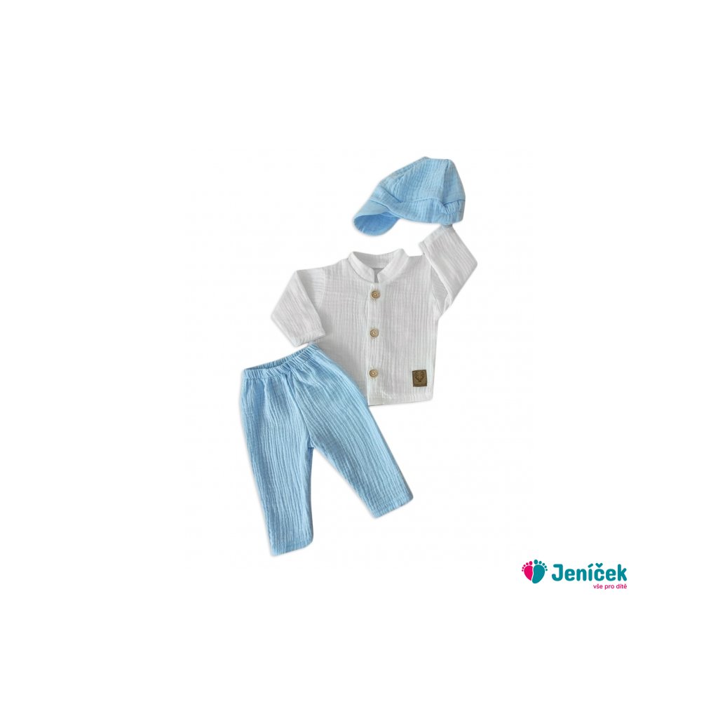 Elegantní mušelínová 3D sada - košile, kalhoty + čepice, 3D sada, bílá/modrá