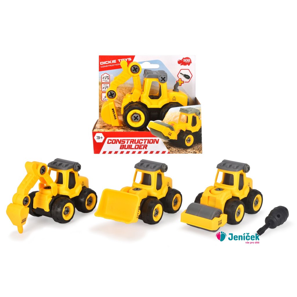 Žluté stavební autíčko na volnoběh, součástí šroubovák. 4 druhy. Velikost 12,5 cm.