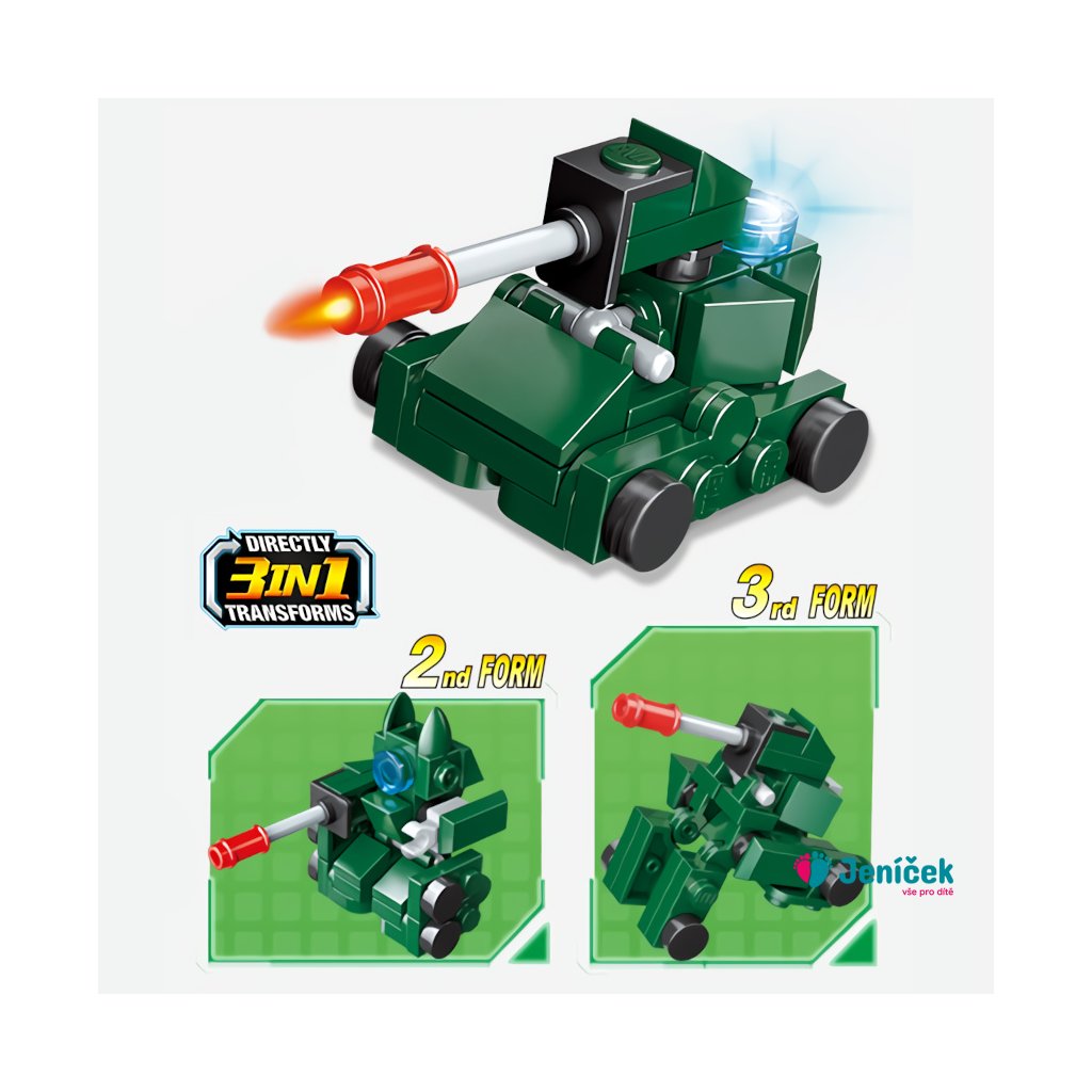 Qman Trans Collector 3v1 2106-2 Tank Dejte šanci své kreativitě! Z této stavebnice je možné složit tři různé varianty. Balení obsahuje 36 dílků. Stavebnice je kompatibilní s Lego, Sluban a dalšími stavebnicemi tohoto typu.