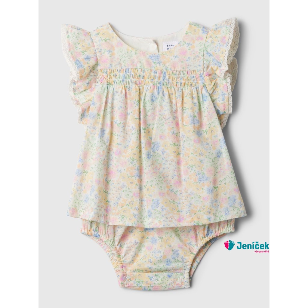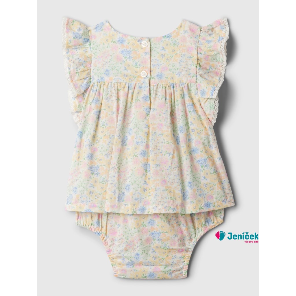 Bavlněné body se sukýnkou.Kulatý výstřih se zapínáním za krkem.Krátké volánkové rukávy.Zapínání na druky.Našitá nabíraná sukýnka.Drobný vzor v pastelových barvách. 100% bavlnaDoplňkové parametry