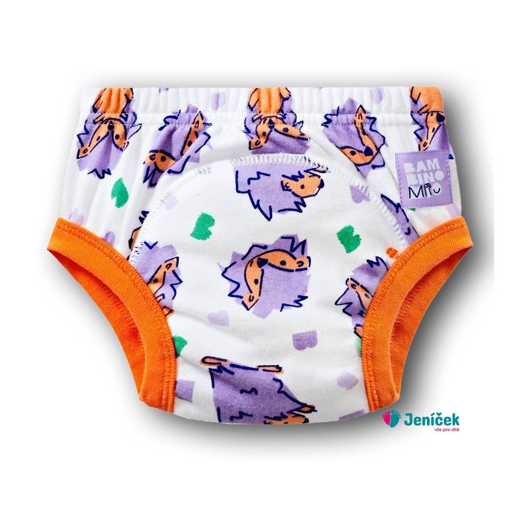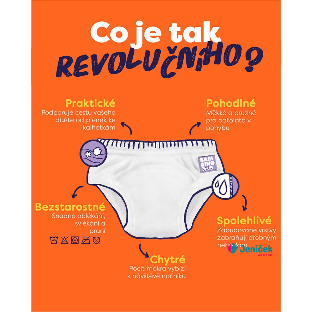 Nepropustná vrstva spolu s absorpční vrstvou částečně chrání před znečištěním okolí. Pomáhají zrychlit proces učení se na nočník avšak nenahrazují plenky. Můžete je dát dítěti jako dárek. Dodají dítěti pocit, že již vyrostlo a plenky nepotřebuje. Nepoužívejte je dříve než je dítě k přechodu na nočník připraveno. Učící plenkové kalhotky sice obsahují absopční vrstvu, která zachytí menší množství moči, ale nenahrazují plnohodnotně vícevrstvou plenku s kalhotkami. Jsou určeny pro dítě, které již přechází na nočník a občas se mu přihodí nepříjemná příhoda. V učících plenkových kalhotkách vlhkost ihned ucítí, může si ji uvědomit a posadit se na nočník. Učící plenkové kalhotky nedávejte dítěti na noc či na spaní a pokud nemáte jinou možnost vložte do nich ještě další vícevrstvou plenku Bambino Mio, která doplní absorpční kapacitu. Před prvním použitím učící plenkové kalhotky minimálně dvakrát předeperte.