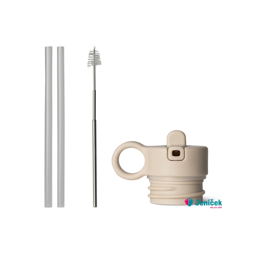 - Dodává se s 1 uzávěrem s pítkem, 2 brčky, 1 čisticím kartáčkem, 1 protiskluzovým silikonovým límcem
