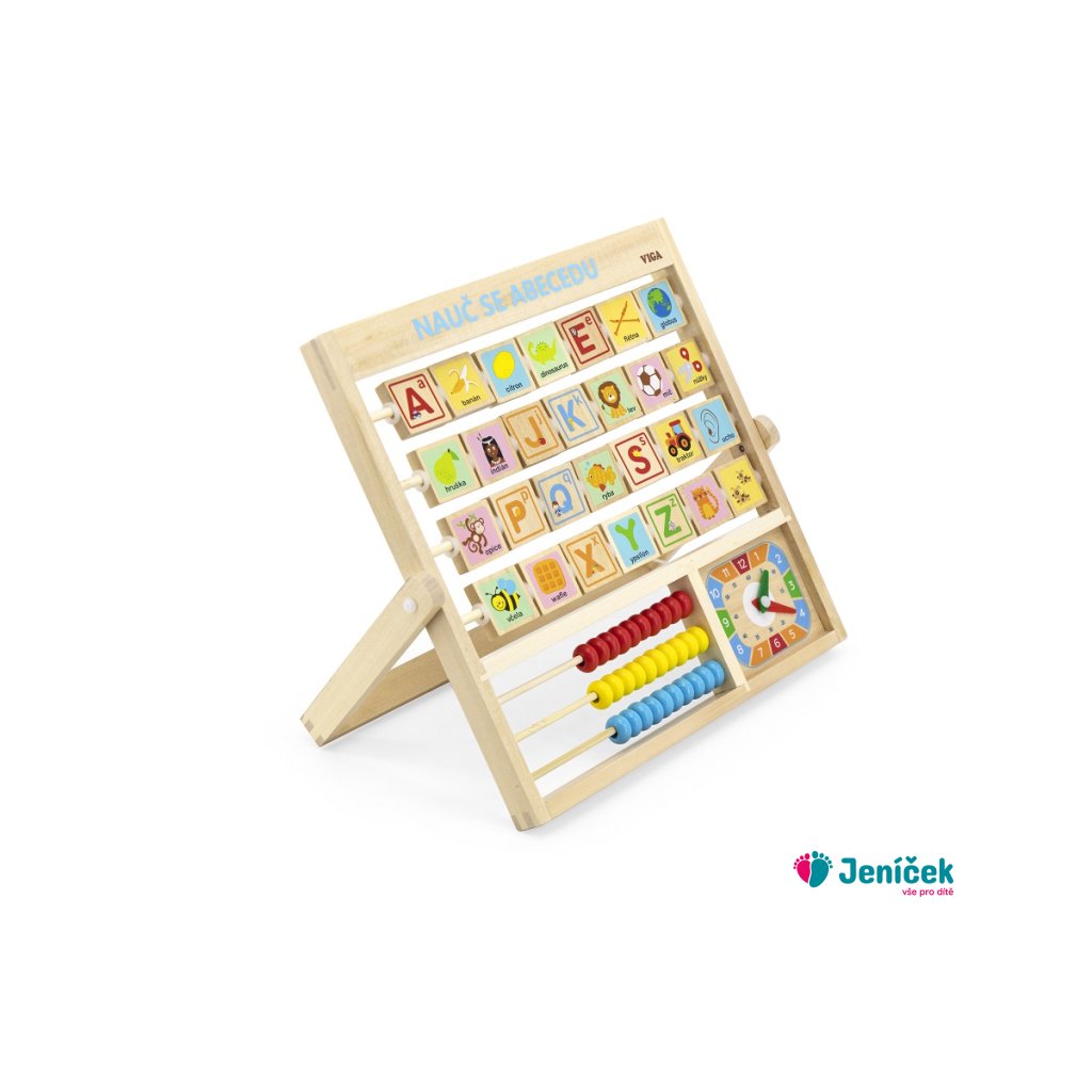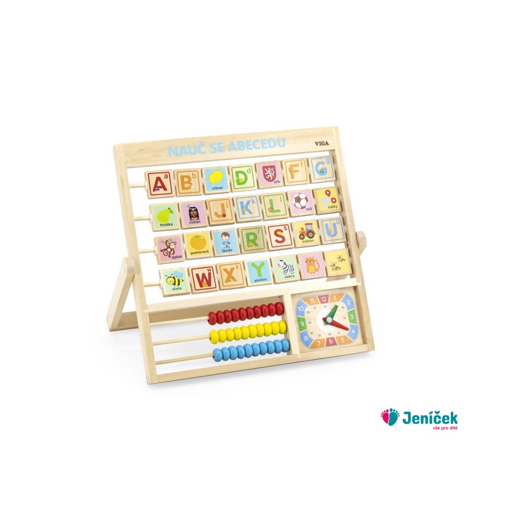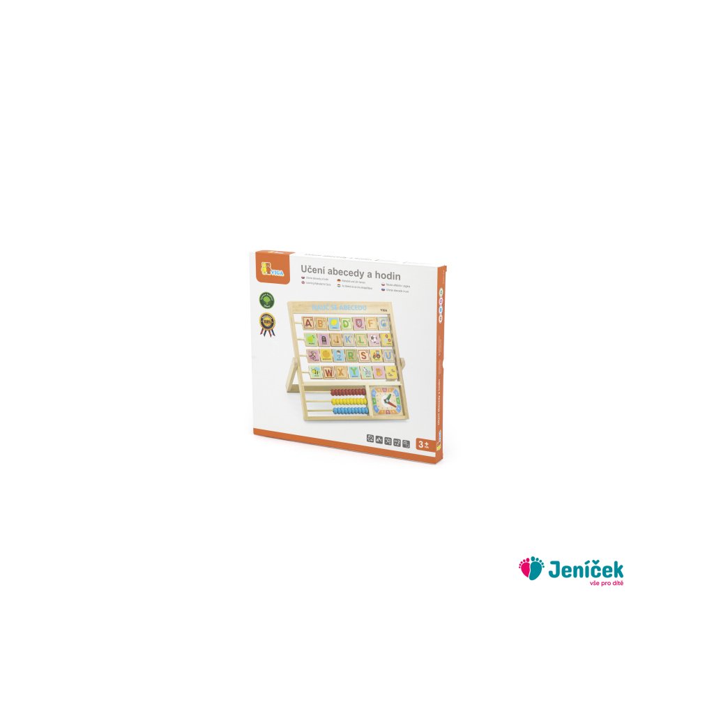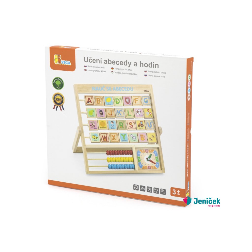 Dřevěná abeceda a hodiny. Děti se mohou naučit písmena, čísla a získat obecnou představu o hodinách. Každé písmeno má na druhé straně slovo pro lepší zapamatování. Rozměry cca 32,5 x 32 x 2,3 cm. Rozměry balení cca 34 x 32,5 x 3 cm. Věk 3+