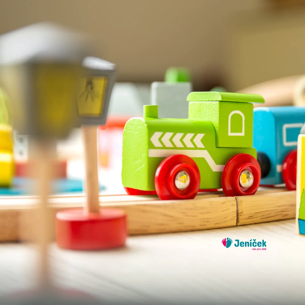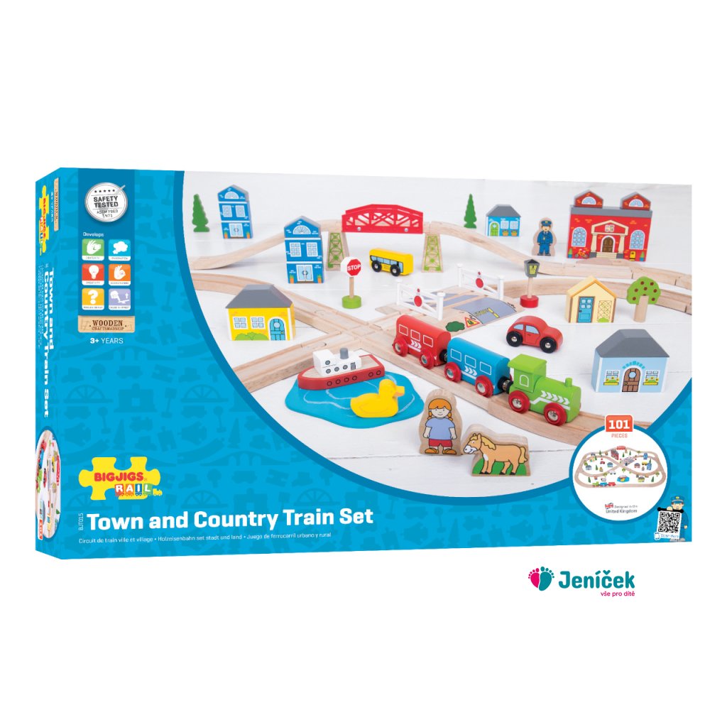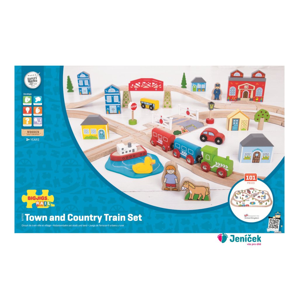 Bigjigs Rail Dřevěná vláčkodráha město a vesnice 101 dílů Sada obsahuje 101 kusů. Vláček jezdí přes město, přes most a ven do přírody, projíždí mezi stromy, domy a kolem kostela. Mezitím musí auta trpělivě čekat na vlakovém přejezdu, aby stihl vláček dorazit na nádraží přesně na čas.Součástí balení je vše dle hlavního obrázku. Hlavní vlastnosti: Vláčkodráhy a jejich příslušenství značky Bigjigs Rail je možno kombinovat se všemi dalšími dřevěnými vláčkodráhami na trhu.Vyrobeno z kvalitních a zodpovědně získaných přírodních materiálů.Odpovídá současným evropským bezpečnostním normám.Podporuje představivost, obratnost a koordinaci. Anglická značka Bigjigs byla založena roku 1985 a zpočátku se zabývala výrobou pouze dřevěných puzzlí. Majitelé vyráběli vše ručně s láskou v malém zahradním domku, své výrobky prodávali na trhu. Spokojení zákazníci výrobce motivovali k mnoha dalším nápadům a rozšíření nabídky o další dřevěné hračky. Přibylo zasílání poštou a prodej přes katalog. Spokojenost a věhlas značky rostla, takže následoval velkoobchodní prodej a pro udržení výrobních cen přesun a rozšíření výroby na východ. Nové značky kvalitních a nápaditých hraček si v Anglii všimly další velké prodejní firmy.Dnes Bigjigs hračky zůstávájí ve vlastnictví rodiny s obrovskými sklady v jiho-východní Anglii. Společnost i nadále dodává své hračky široké zákaznické základně ve Velké Británii a západní Evropě podpořená loajálním, oddaným a tvrdě pracujícím týmem zaměstnanců. Veškeré dřevěné hračky BigJigs jsou navržené v Anglii a vyrobené jak tamtéž, tak i ve východní Evropě a jihovýchodní Asii. Kvalita hraček značky BigJigs je testována a odpovídá všem podmínkám pro prodej v EU a USA.