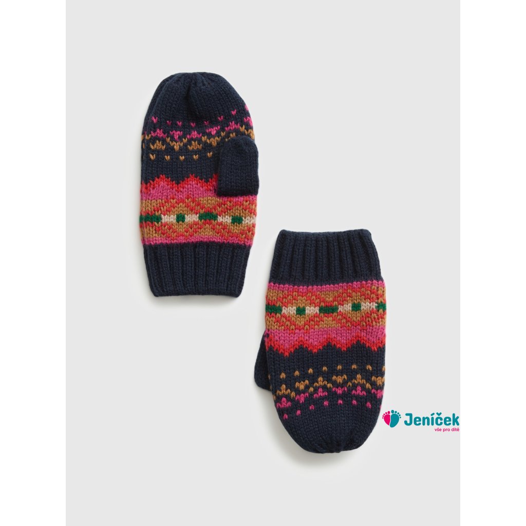 Dětské pletené rukavice. Střih palčáky. Výrazný norský vzor. Pružný žebrovaný lem. 60% organická bavlna, 40% recyklovaný polyester